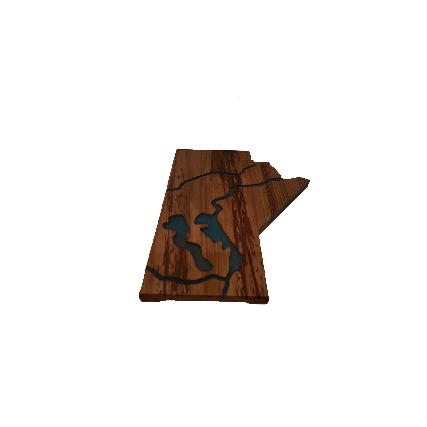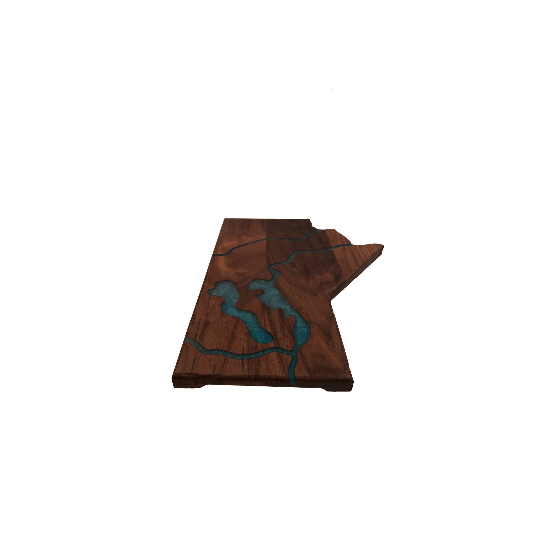 This Manitoba-shaped charcuterie board is made of solid walnut, and the province's major lakes and rivers are featured in epoxy. It has two built-in drink/can holders. It is 16" long and measures 12" at its widest point. It has been finished with food-safe mineral oil. Additional photographs can be provided on request.