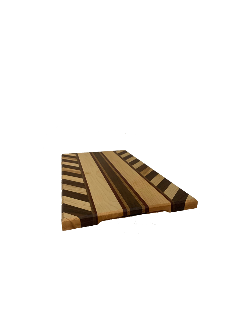 This board is made with a walnut and maple chevron-style edge with a centre strip made of maple, walnut, white oak and bloodwood. It is an oversized board at 11" by 20" and it has been finished with food-safe mineral oil. Additional photographs can be provided on request.