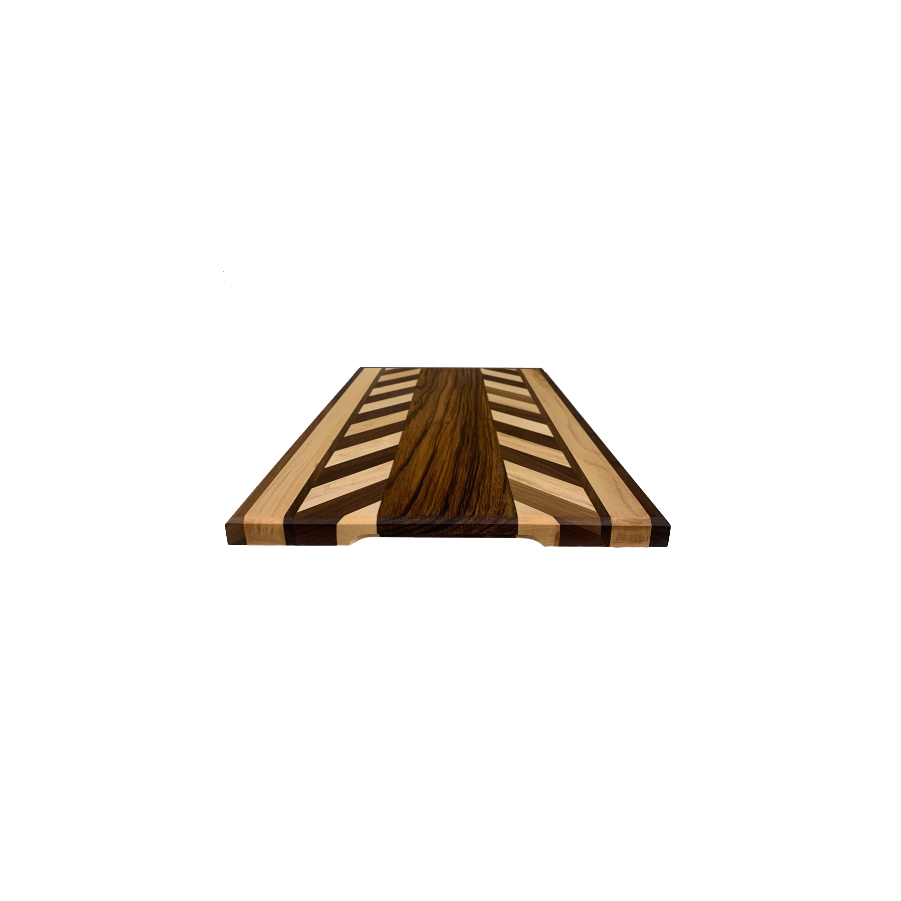 This board is made of a perpendicular pattern of walnut and zebrawood. Its dimensions are 12" x 16" and it has been finished with food-safe mineral oil. Additional photographs can be provided on request.